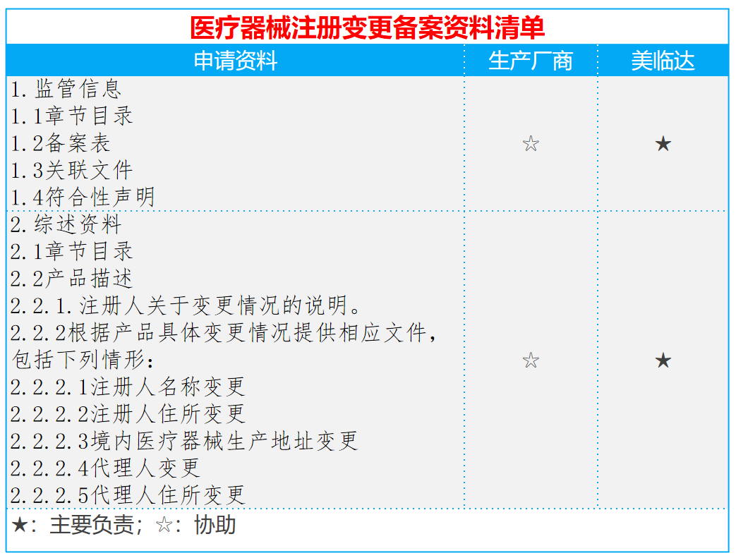一、监管信息 (一)章节目录 (二)备案表 (三)关联文件 (四)符合性声明 二、综述资料 (一)章节目录 (二) 产品描述 1.注册人关于变更情况的说明。 详细描述本次变更情况、变更的具体原因及目的。 2.根据产品具体变更情况提供相应文件,包括下列情形: (1)注册人名称变更 企业名称变更核准通知书(境内注册人)和/或相应关联文件。 (2)注册人住所变更 变更前后企业营业执照副本或事业单位法人证书复印件(境内注册人)和/或相应关联文件。 (3)境内医疗器械生产地址变更 变更后的生产许可证及其附件。 (4)代理人变更 ①注册人出具新代理人委托书、新代理人出具的承诺书; ②新代理人的营业执照副本复印件。 (5)代理人住所变更 变更前后营业执照副本复印件。