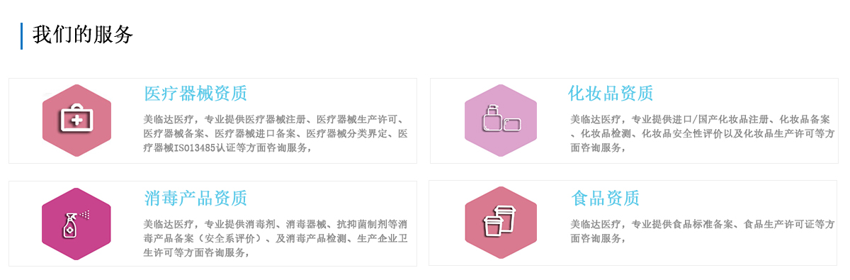 了解美临达 美临达医疗,专注于企业资质咨询,可提供ISO体系认证、医疗器械化妆品、消毒产品、食品相关资质及配套服务。 |